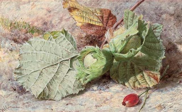 Still life of hazelnuts and a rose hip