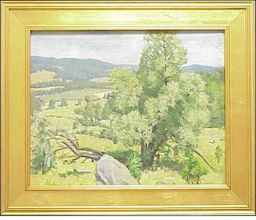 | Impressionistic landscape with a large rock and tree in foreground and green rolling hills and a barn in the distance under a bl | |