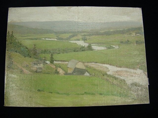 painting of a river valley with house and barns