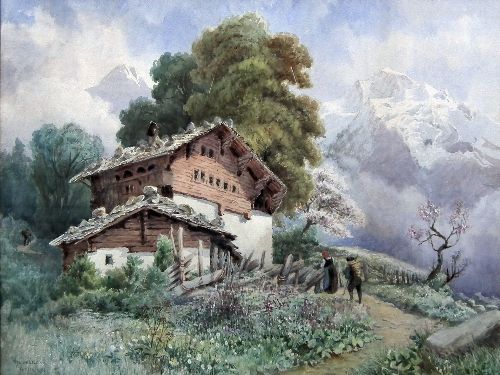 | Alpine landscape in spring with a view of a Swiss chalet and two figures on hillside to foreground, and with snow covered Alps t | |