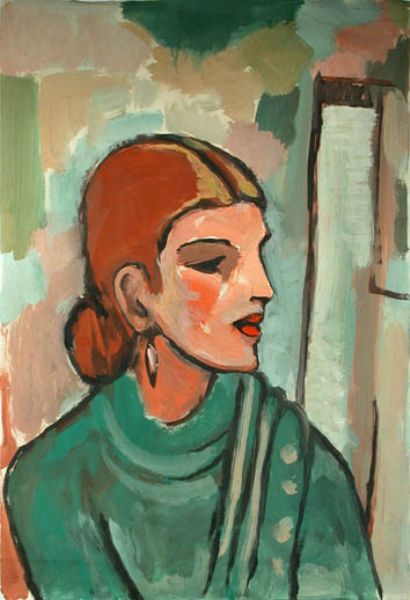 | Brustbild einer jungen Dame mit geknotetem Haar und langen Ohrringen vor changierendem Hintergrund. | |