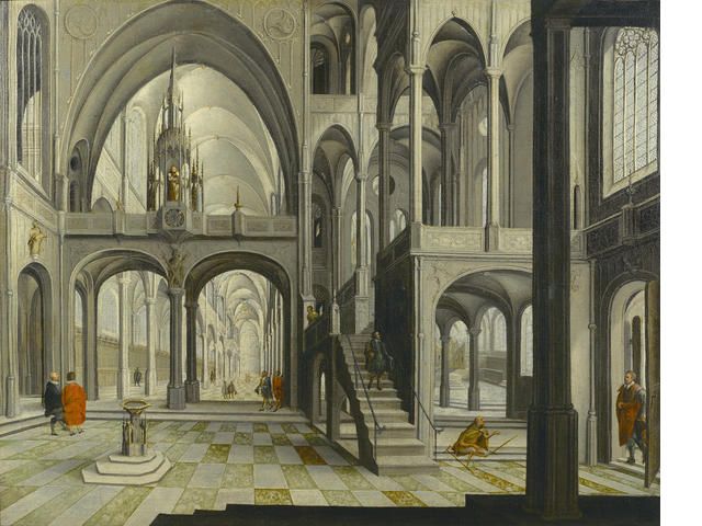 A church interior with figures