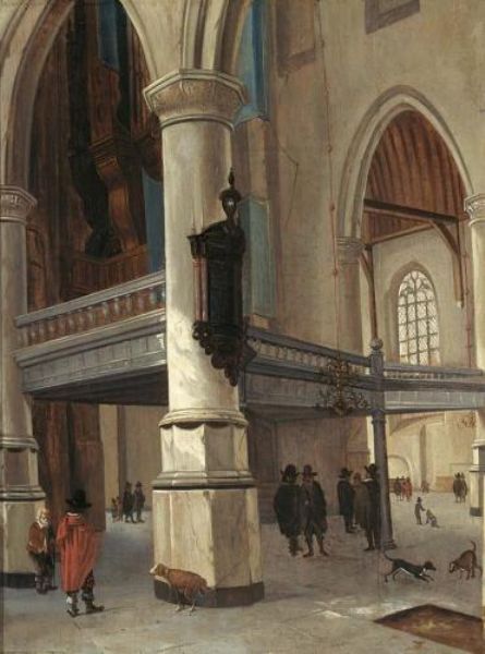 A CHURCH INTERIOR WITH FIGURES AND DOGS