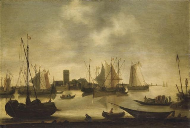 Shipping an estuary, by a walled town