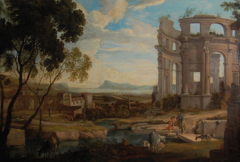 | Paesaggio di fantasia con rovine, figure e animali sullo sfondo del Circeo | |