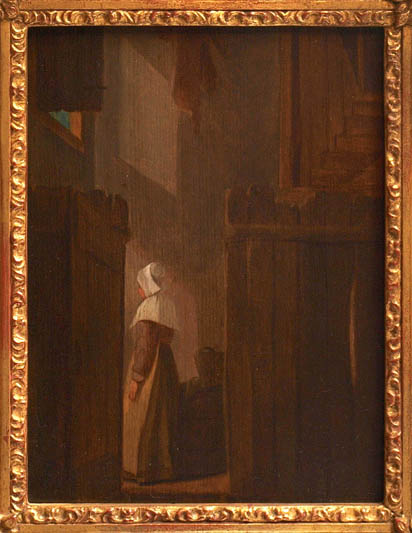 | Hinter einer halb geöffneten Brettertüre steht eine Magd in einem Raum, der durch ein oben liegendes Fenster erhellt wird | |