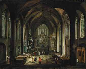 | Interior of a Gothic church with a friar preaching from the pulpit, elegant figures conversing in the foreground | |