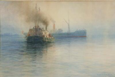 Freighter Crossing Astern of a Scow, Boston, watercolor on paper, signed lower right, ca. 1890, in gilt molded frame, matted and glazed, OS: 28" x 38", SS: 18 3/4" x 29". Fine condition. | |