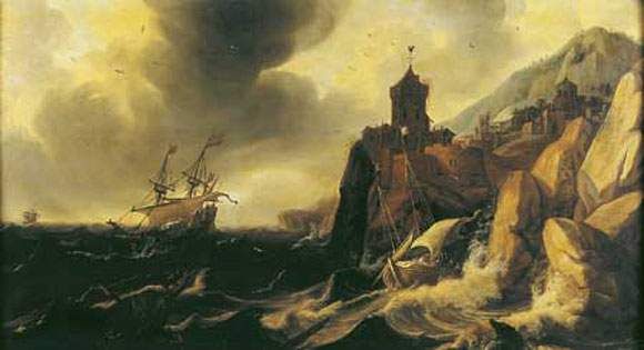 BATEAU PRIS DANS LA TEMPÊTE LE LONG D'UNE CÔTE ROCHEUSE