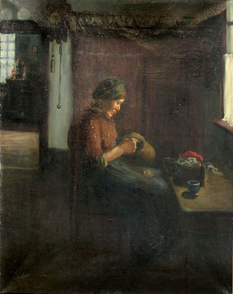 Interieur mit nähender Frau
