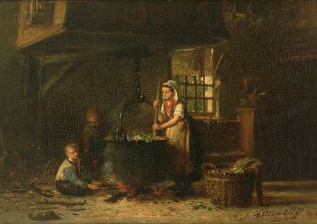 Blick in eine alte Küche mit Mutter und zwei Kindern am Kochkessel