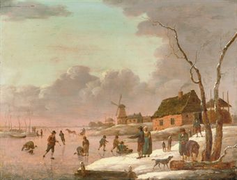 | A winter landscape with skaters on a frozen river and townsfolk on the banks, a windmill beyond | |