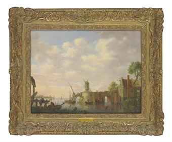 | A river estuary with fishermen and stevedores, a dock and a windmill beyond | |
