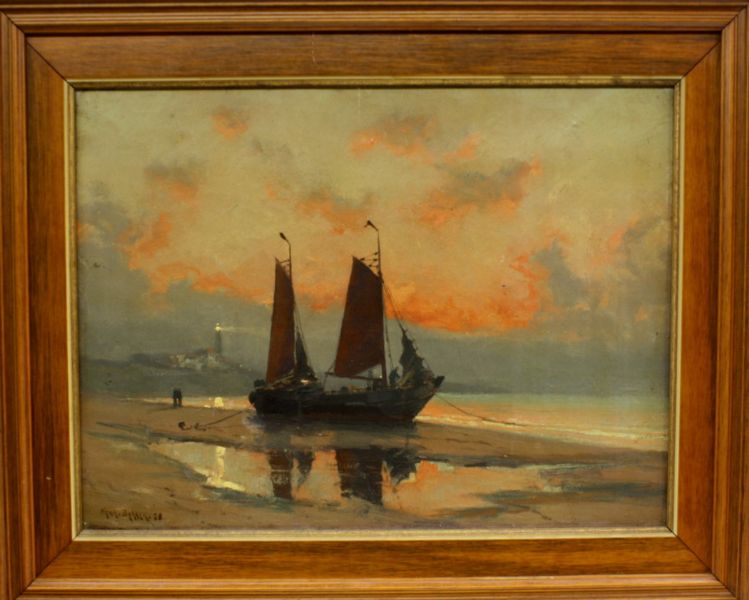 Bomschuiten op het Scheveningse strand bij zonsondergang