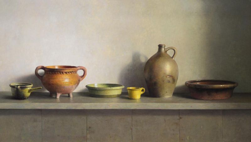 | Still life of a terracotta bowl, a stoneware flask and other pottery vessels on a ledge | |