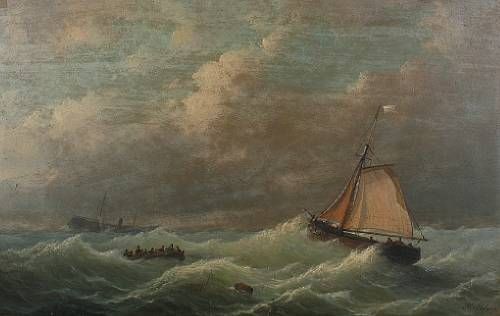 Boats in a stormy sea, a sinking ship in the distance