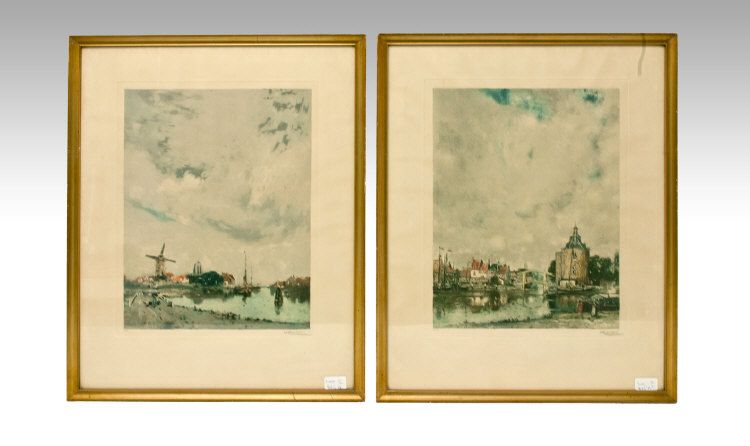 Dutch river scenes, windmills & buildings on bank of river. Cloudy skies