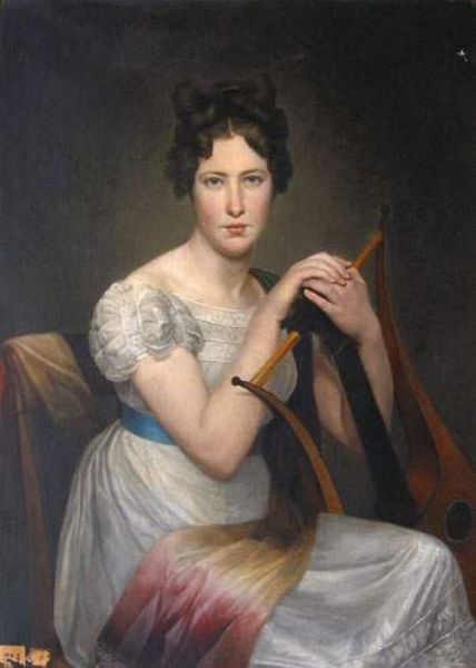 | Portrait de jeune femme en robe de mousseline blanche à ceinture bleue, ses mains posées sur une Lyre | |