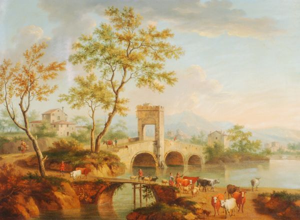 | Drovers and cattle crossing a bridge with a town beyond | |
