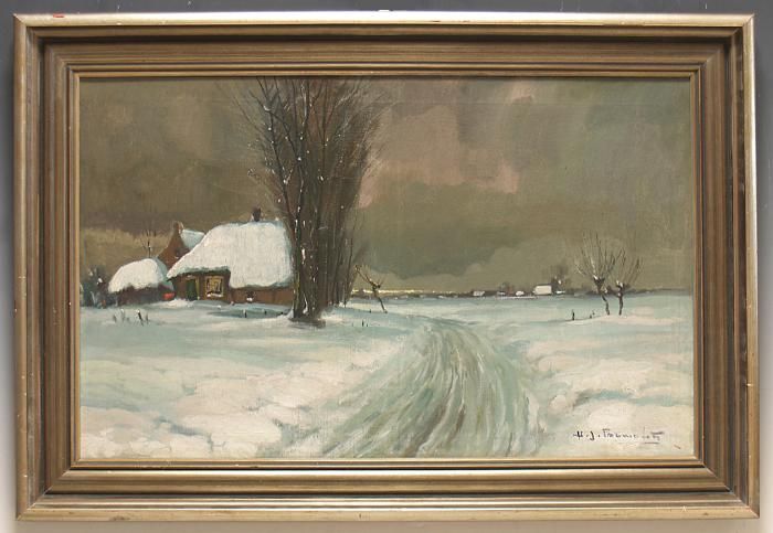 Weite Winterlandschaft mit Gebäuden in der Dämmerung