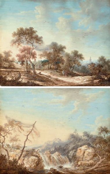 | Travelers with a dog in a wooded landscape, a church steeple beyond; and A wooded landscape with a cascade | |