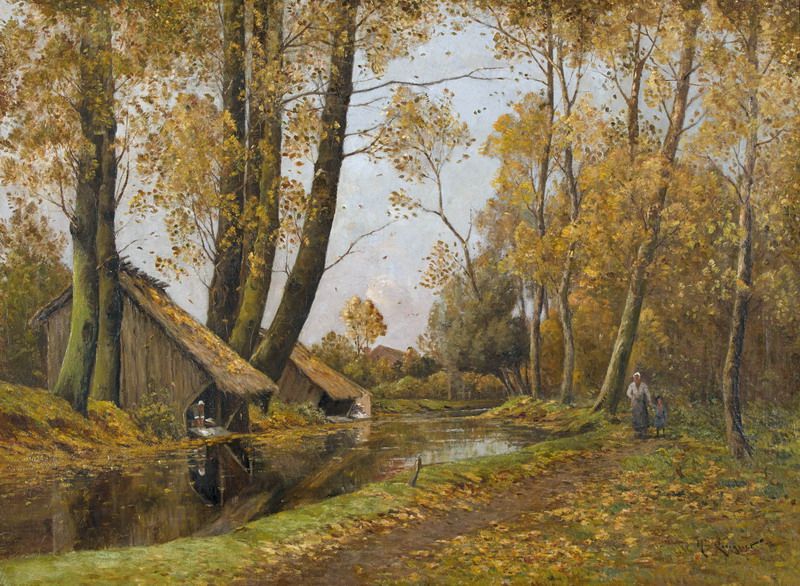 Herbstliche Bachlandschaft mit Wäscherinnen.
