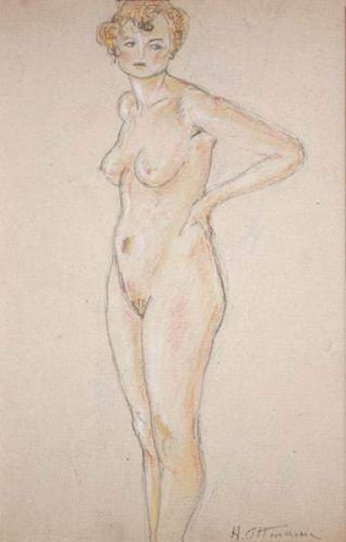 Nu debout, les mains sur les hanches.