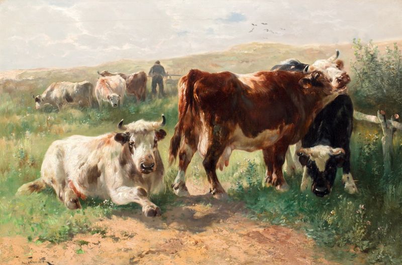 Herder met koeien in zonnig duinlandschap