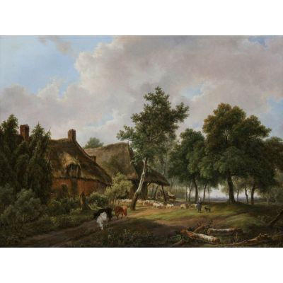 Schapenhoeder bij de hoeve met dorp in de achtergrond