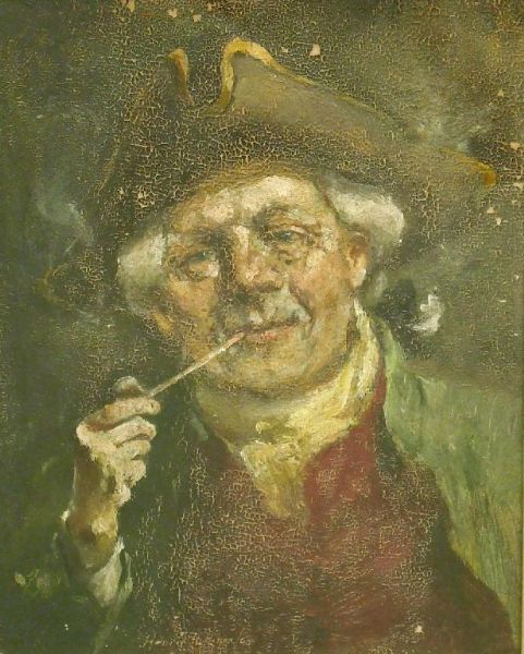 Portrait of an elderly gentleman in a tricorn hat and green coat smoking a pipe