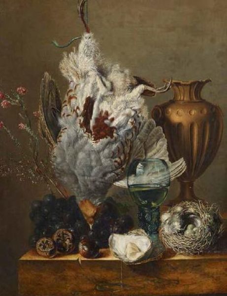 Stillleben mit erlegtem Vogel, Austern und Vogelnest