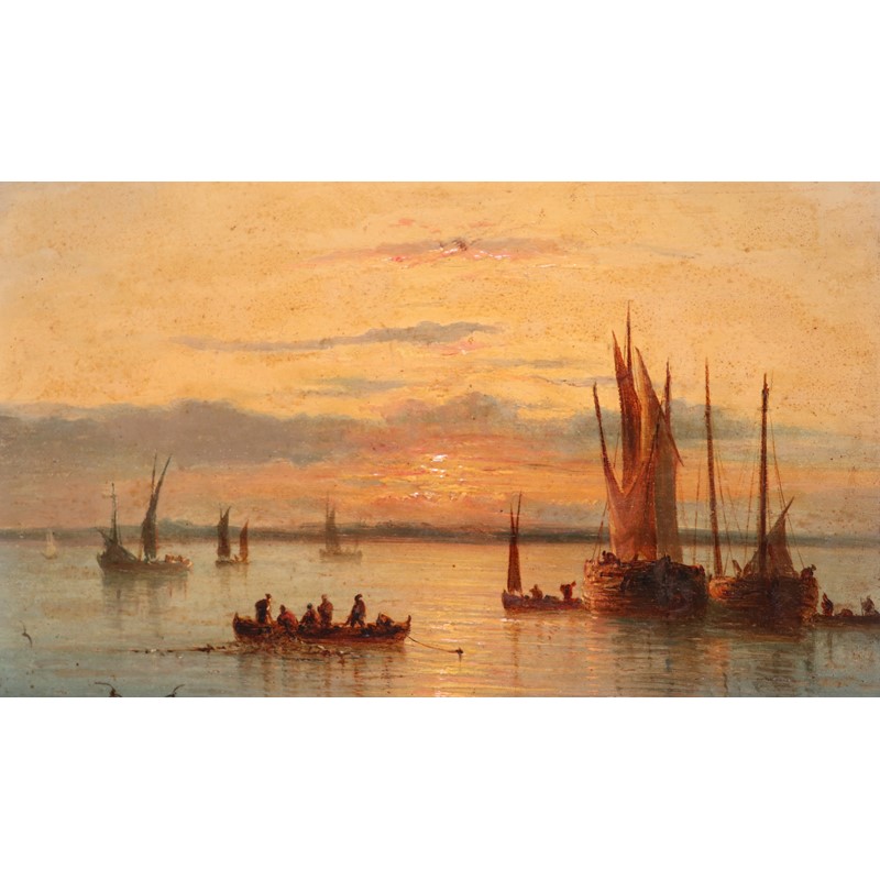 Fishermen and boats on a calm sea at sunset
