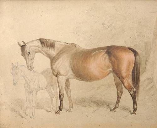 Study of bay horse and foal