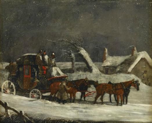 THE DOVER TO LONDON COACH AT A HALT BY A COTTAGE IN THE SNOW