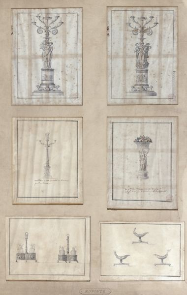 | Six projets d'argenterie : trois projets de candélabres, une corbeille à fruit, un projet de porte carafe, un projet de saucière | |