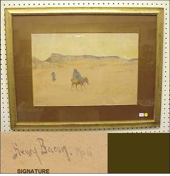 | depicts mother and child on burrow and man on foot crossing desert with mountains in distance | |