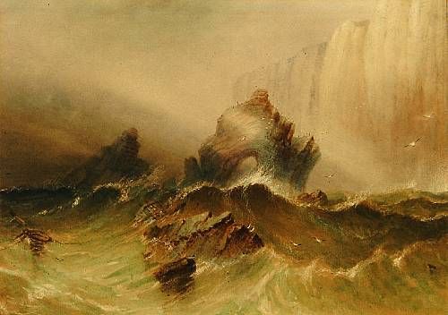 | A beached boat with figures on the sands and horses and carts unloading cargo; Rough seas | |