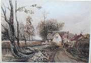 A view of a watermill with a horse and cart on a pathway