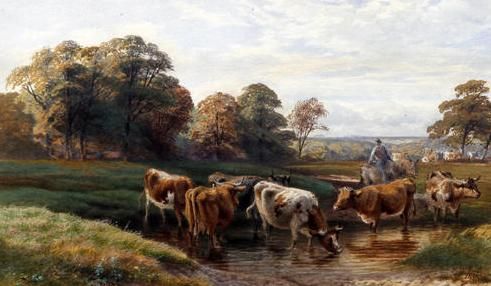 | Cows watering at a stream, with farmer on horseback, and another of sheep resting on a wooded hillside, a pair | |
