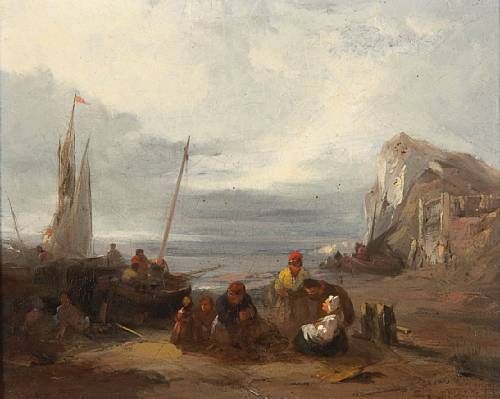 Figures and boats on a beach at sunset