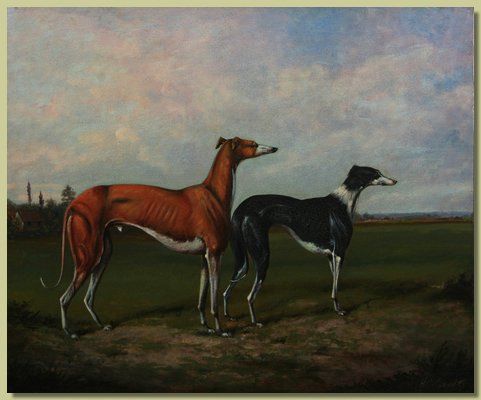 two pointers in a landscape, farm buildings beyond