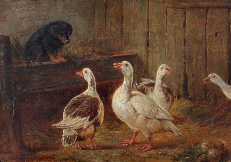Barn Interior Scene with Curious Rottweiler Pup and Protective Geese