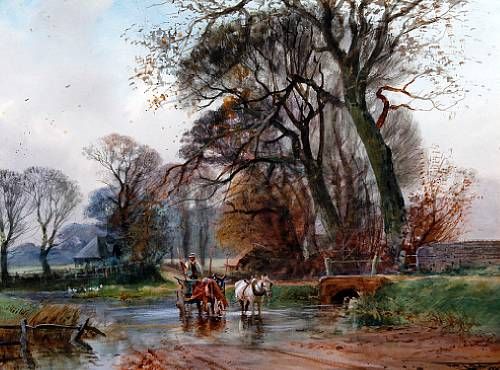 | Farmer, horses and cart crossing a ford, together with another of shepherd and flock on a country path | |