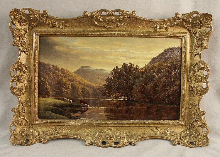 COWS DRINKING IN A MOUNTAINOUS LANDSCAPE