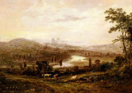 A View of Exeter Cathedral, above the River with cattle and sheep in foreground