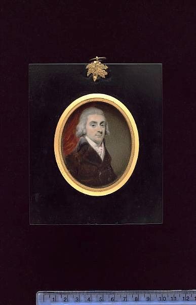 | A Gentleman, wearing brown coat, white waistcoat, frilled chemise, stock and red solitaire | |