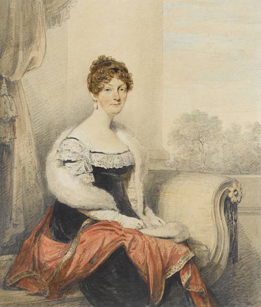 | A Lady, seated on a chaise-longue, wearing black dress with white lace trim, white gloves, fur stole, red mantle draped across h | |
