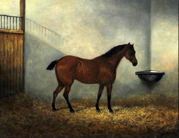 Chestnut hunter in a loose box, and another similar, a pair