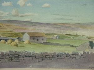 Rural landscape with cottages and a stone wall, hills beyond