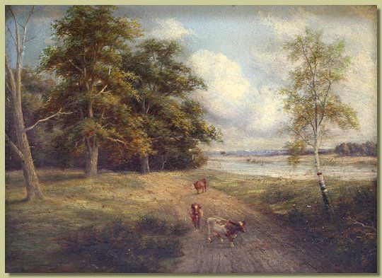 | Sheep grazing by a river bank and cattle on a country path with a river beyond | |